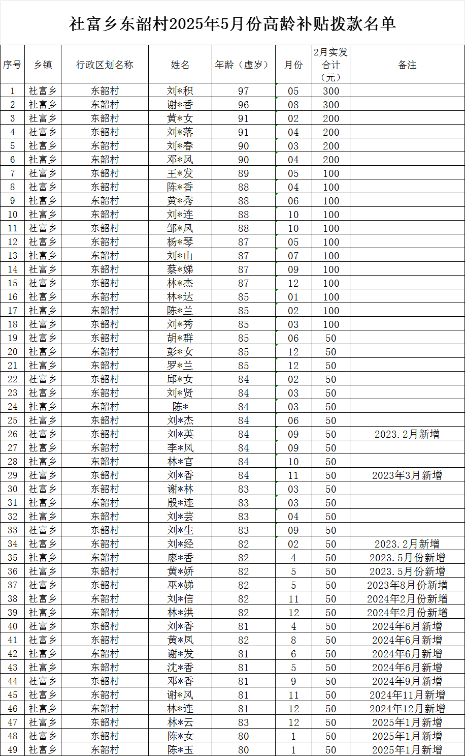 【養老服務】東韶村2025年5月高齡老人長壽名單