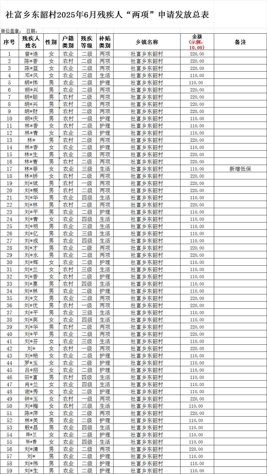 【社會救助】東韶村2025年6月份殘疾人兩項補貼撥款名單公示