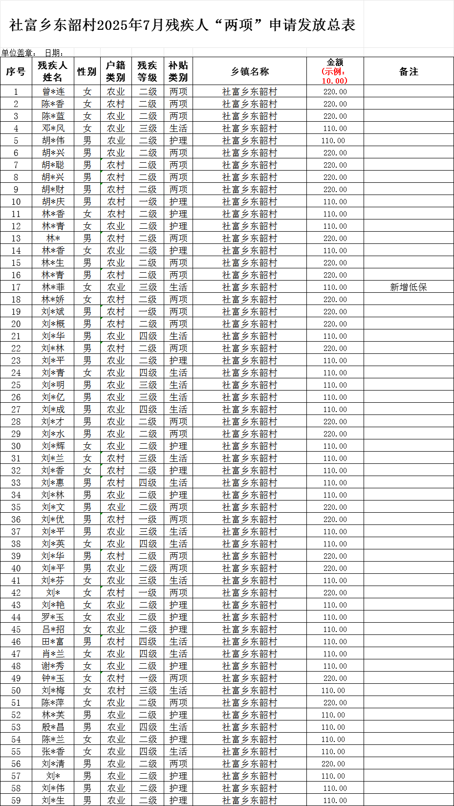 【社會救助】東韶村2025年7月份殘疾人兩項補貼撥款名單公示