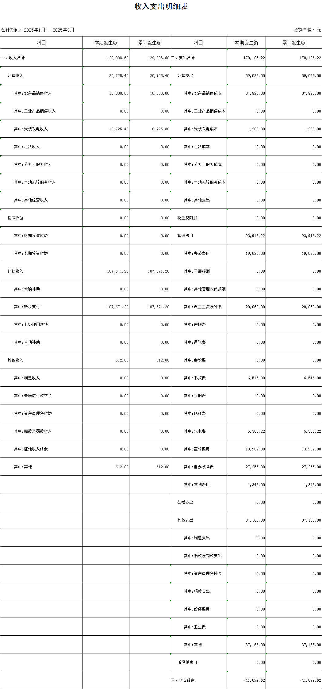 東韶村2025年第一季度村級收入支出明細表