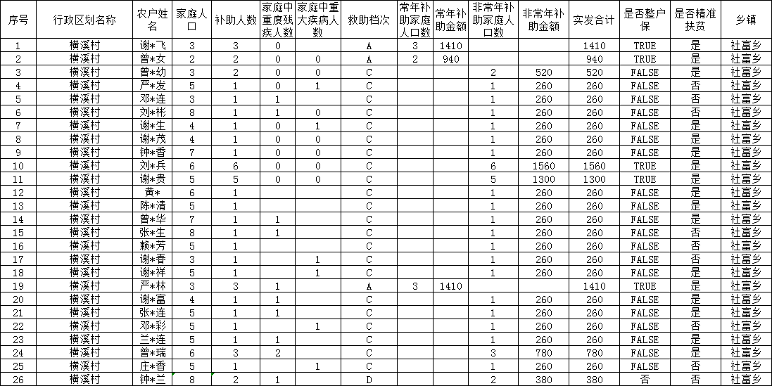 【社會救助】橫溪村2025年6月份農村低保名單公示