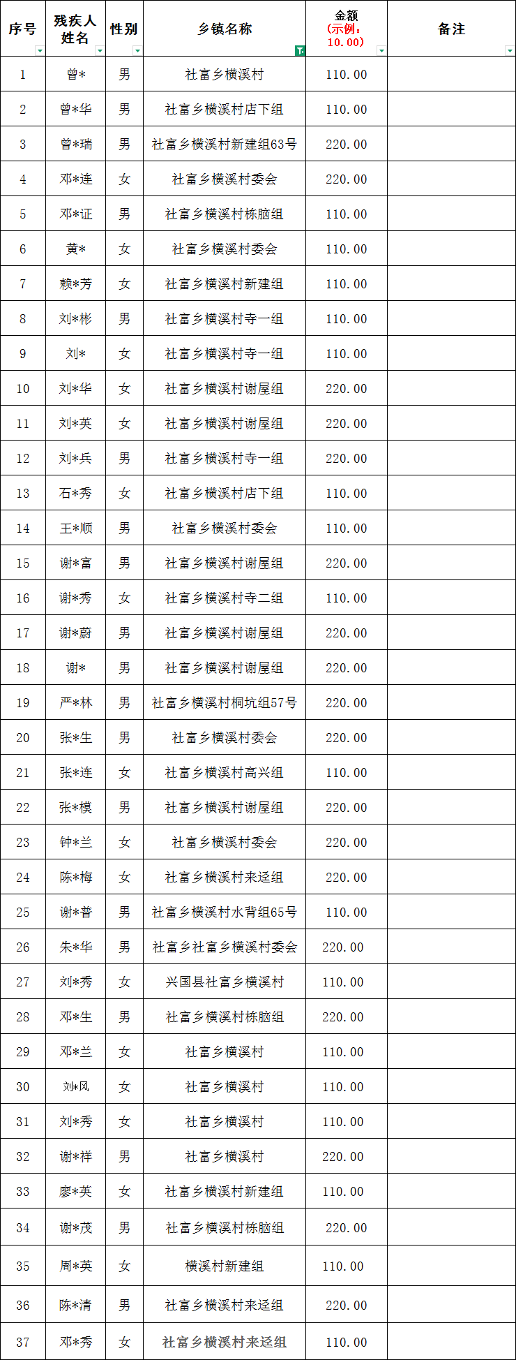 社富鄉橫溪村2026年1月份殘疾人兩項補貼撥款名單
