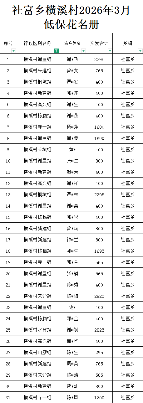社富鄉橫溪村預報2026年3月份農村低保匯總名單