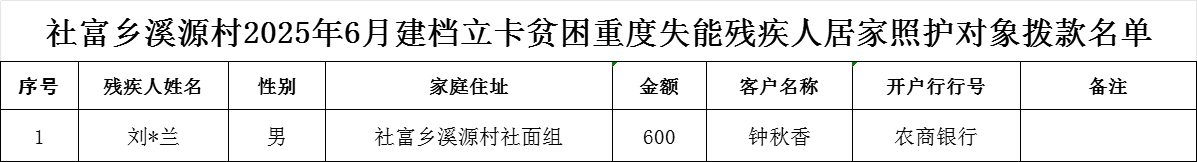 【社會救助】溪源村2025年6月建檔立卡貧困重度失能殘疾人居家照護對象撥款名單