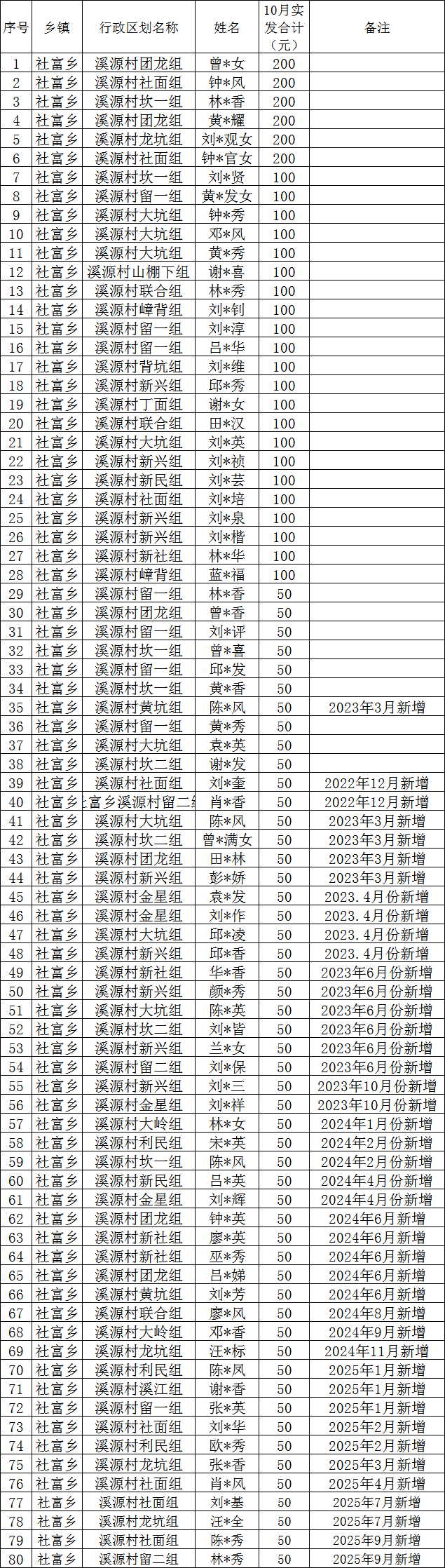 溪源村2025年12月份高齡補貼撥款名單