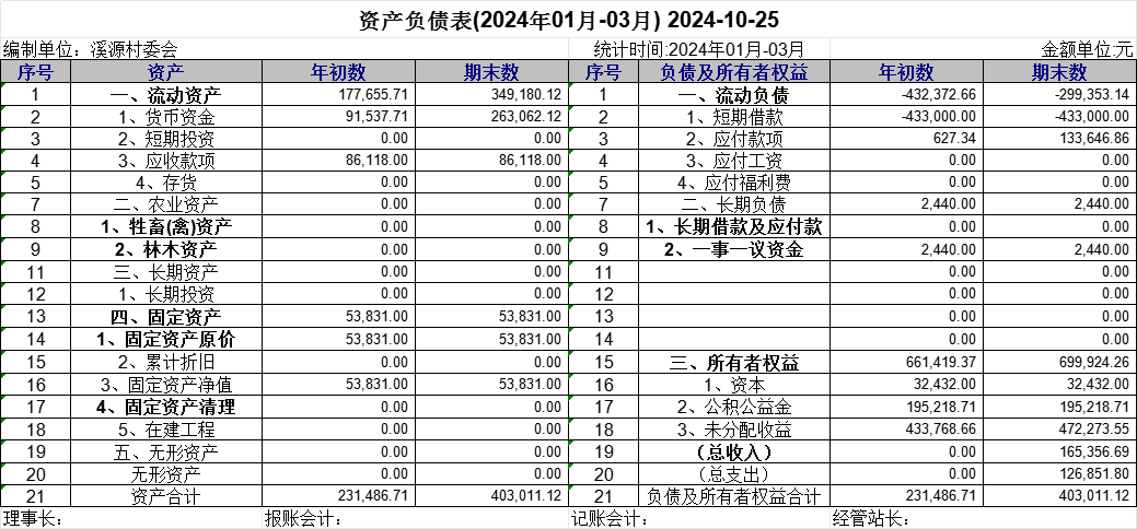 溪源村2024年第一季度資產負債表