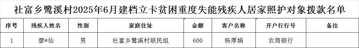 【社會救助】鷺溪村2025年6月建檔立卡貧困重度失能殘疾人居家照護對象撥款名單