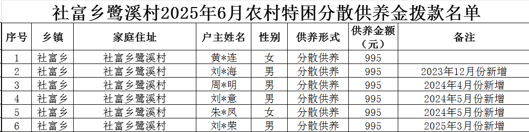 【社會救助】鷺溪村2025年6月特困確認樣表