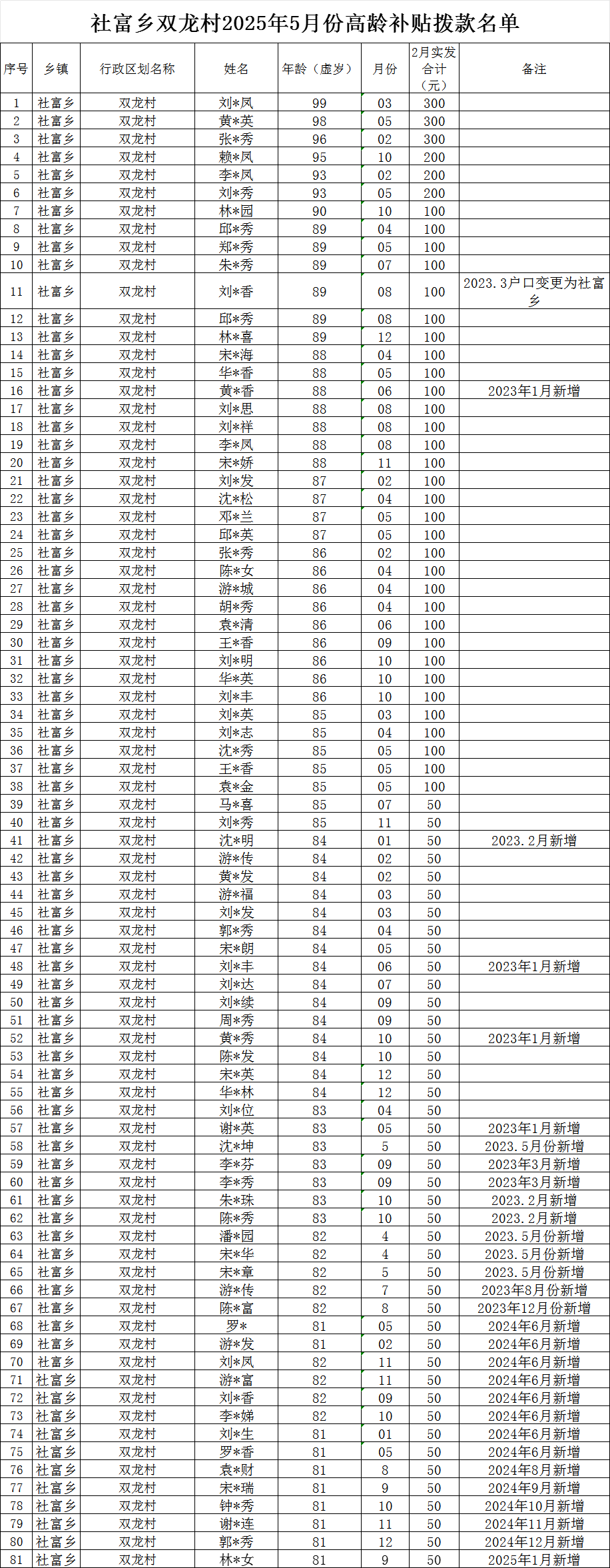 【養老服務】雙龍村2025年5月高齡老人長壽名單