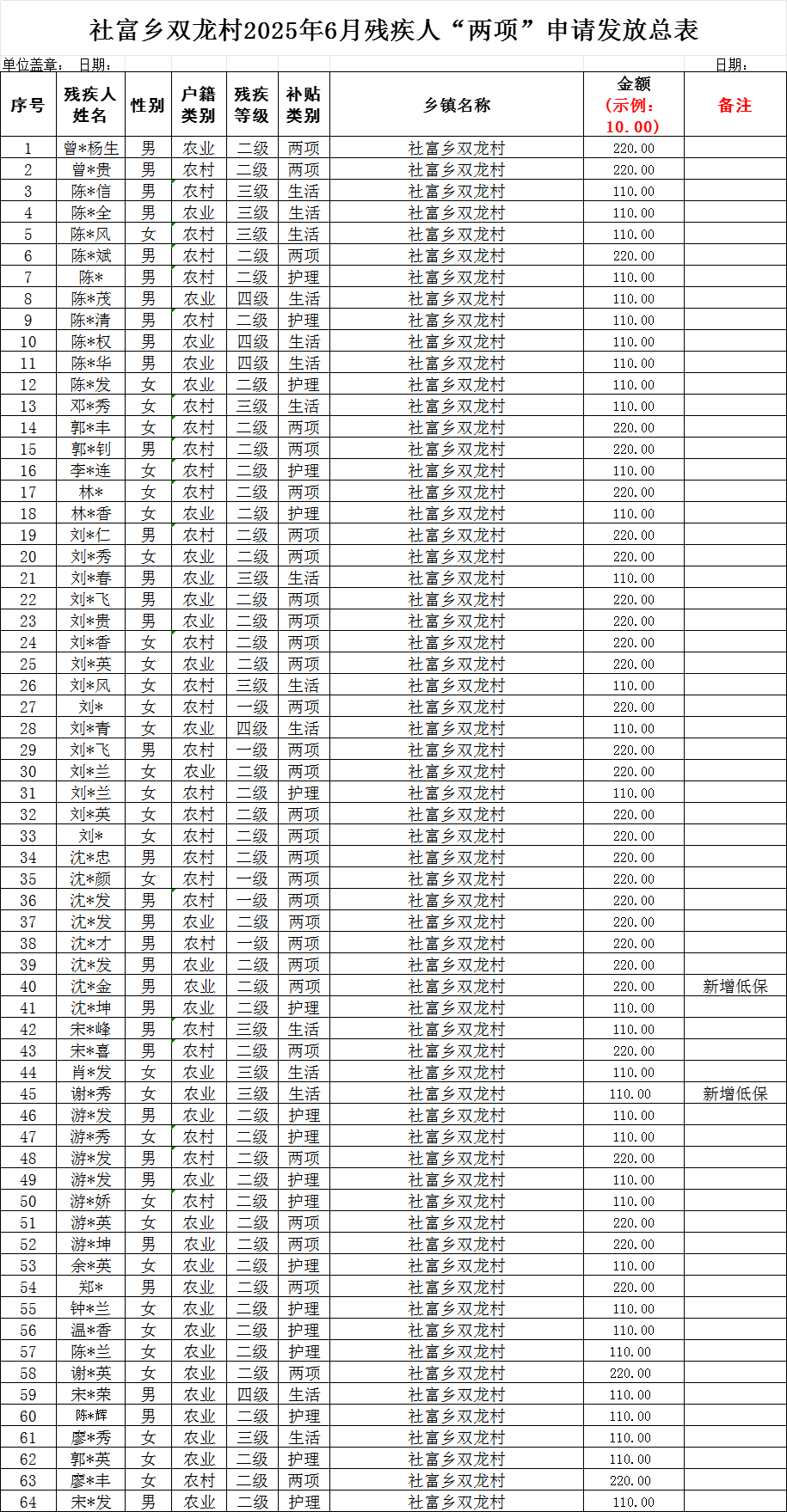 【社會救助】雙龍村2025年6月份殘疾人兩項補(bǔ)貼撥款名單公示