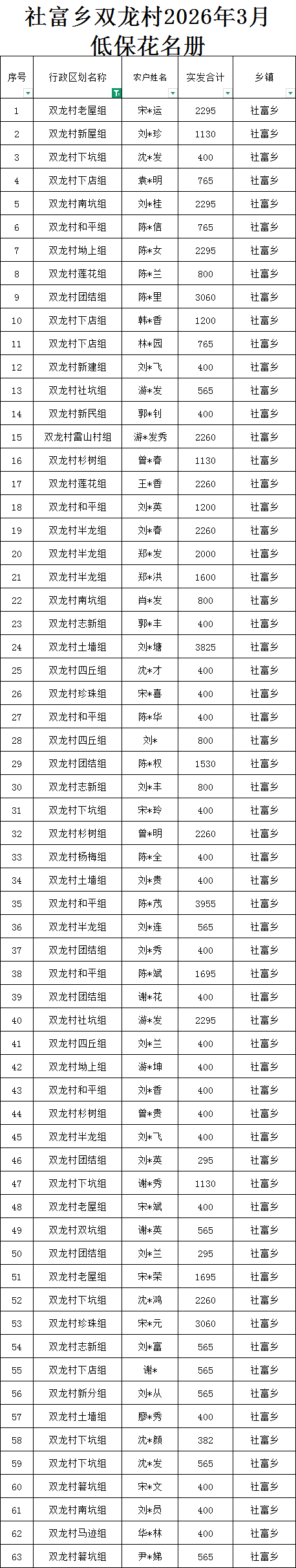 社富鄉雙龍村預報2026年3月份農村低保匯總名單