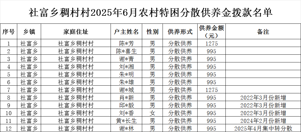 【社會救助】稠村村2025年6月特困確認樣表公示
