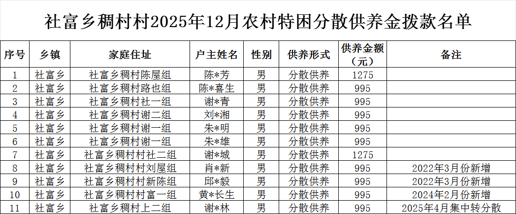 社富鄉(xiāng)稠村村2025年12月農(nóng)村特困分散供養(yǎng)金撥款名單