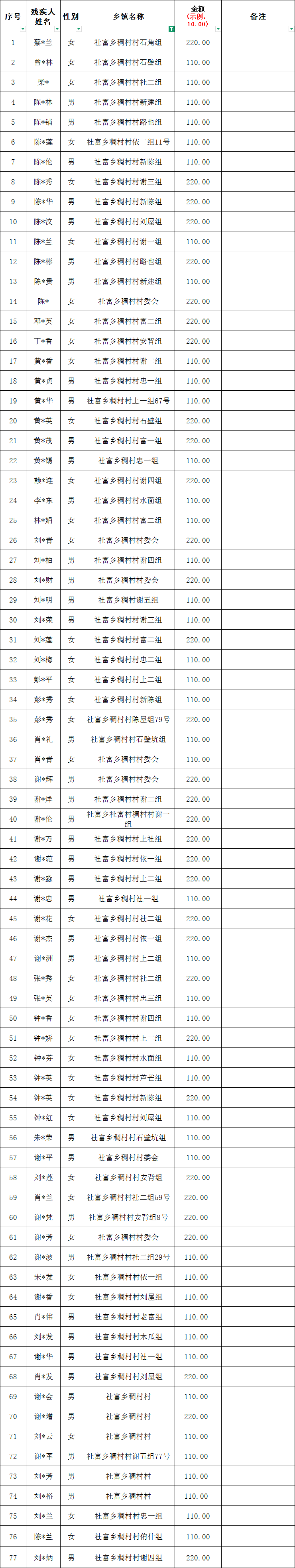 稠村村2026年1月份殘疾人兩項(xiàng)補(bǔ)貼撥款名單