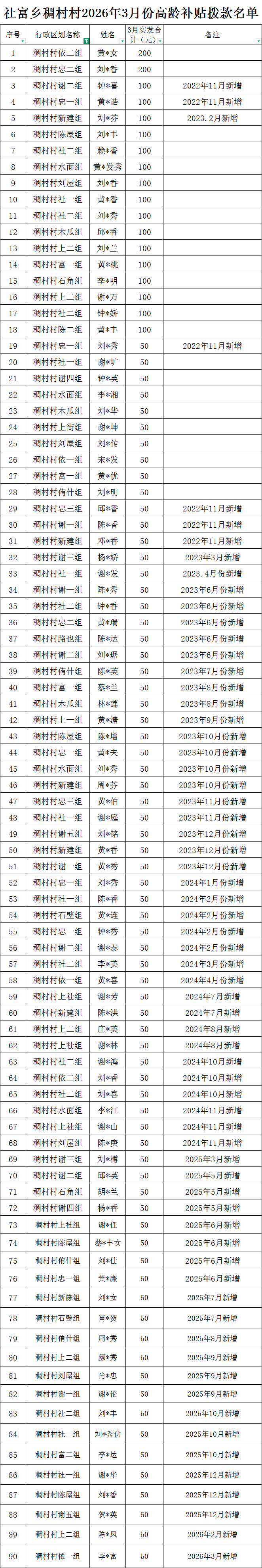 社富鄉稠村村2026年3月高齡老人長壽名單