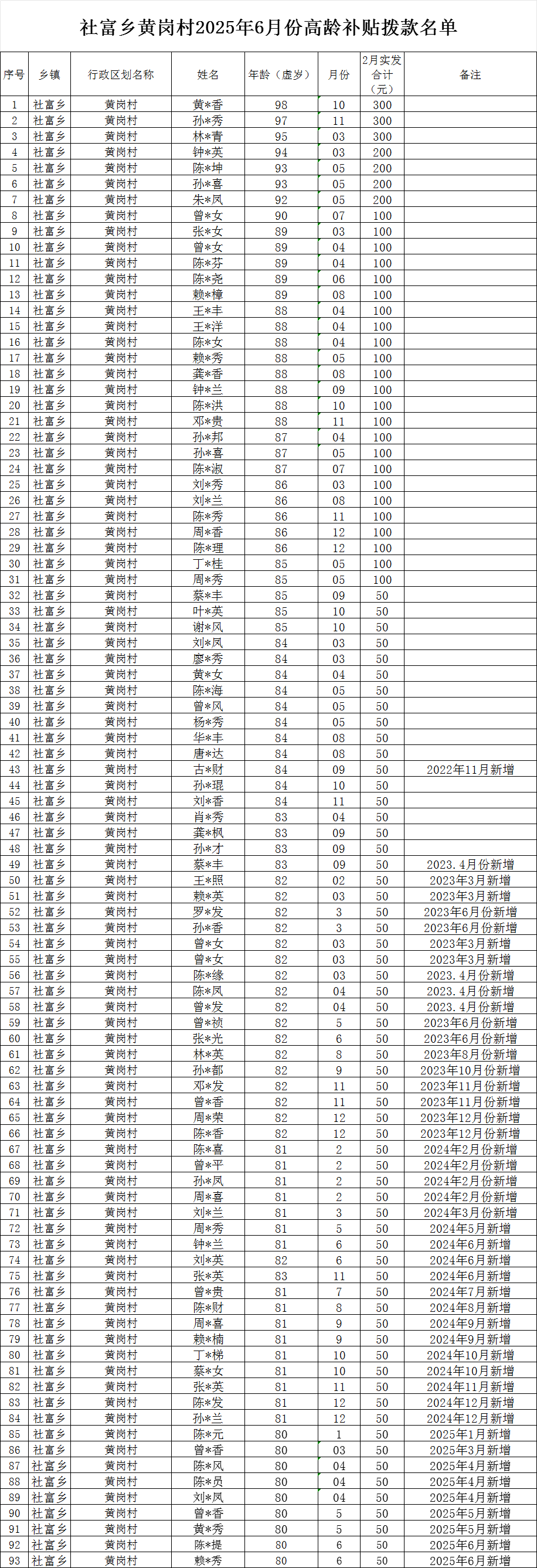 【養老服務】黃崗村2025年6月高齡老人長壽名單