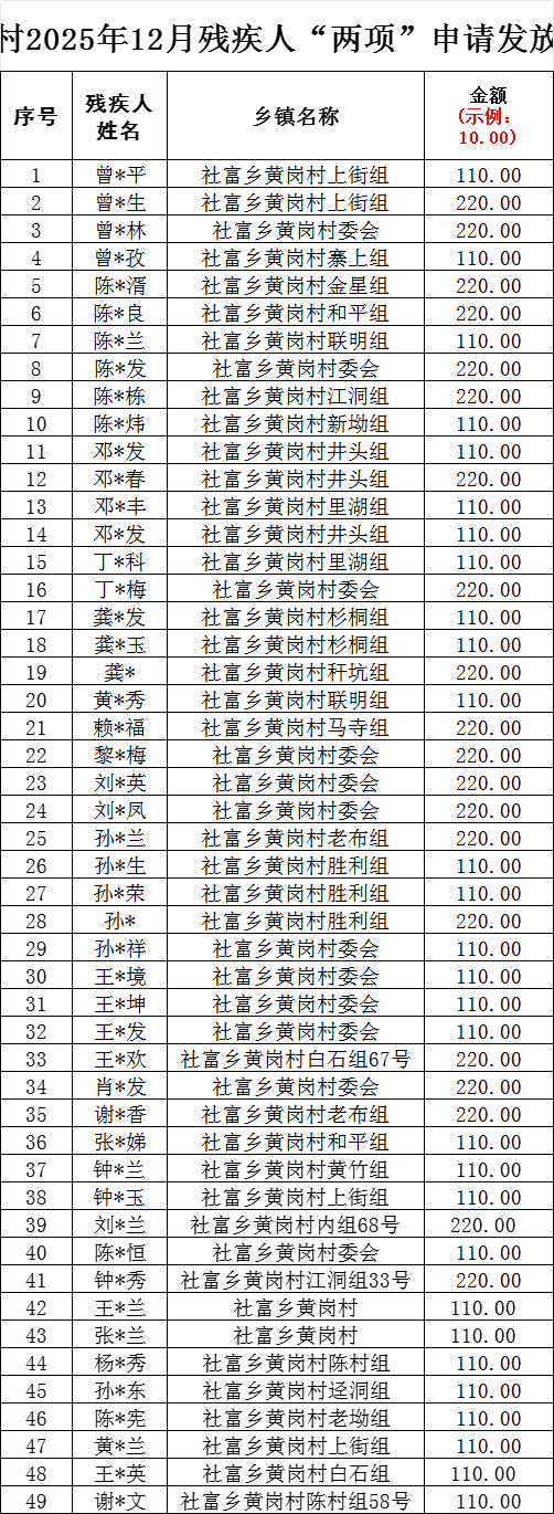 黃崗村2025年12月殘疾人“兩項”申請發放總表
