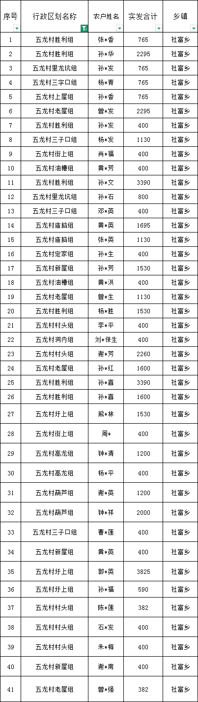 社富鄉五龍村預報2026年1月份農村低保匯總名單