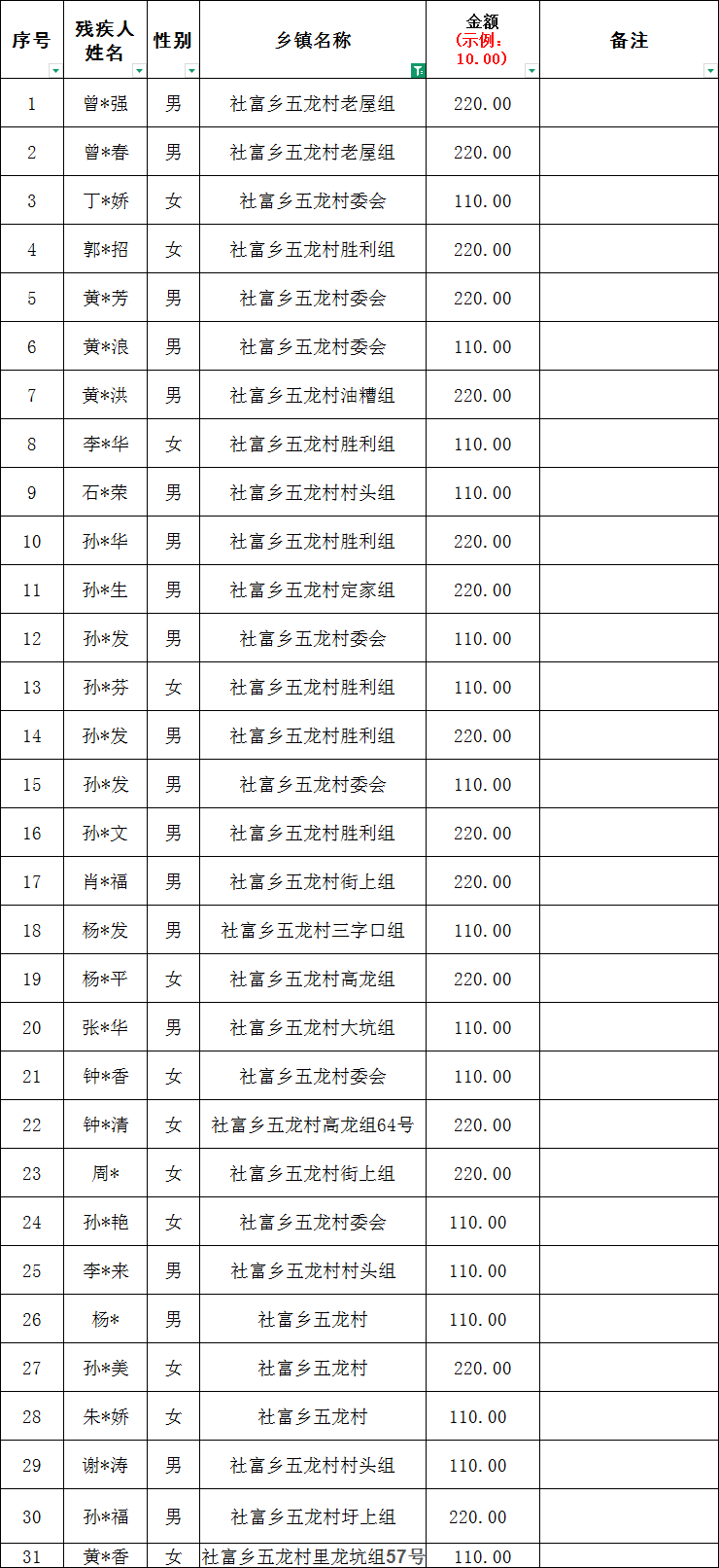 社富鄉五龍村2026年2月份殘疾人兩項補貼撥款名單
