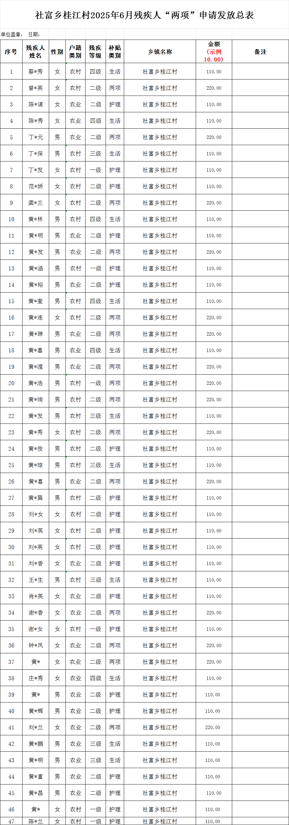 【社會救助】桂江村2025年6月份殘疾人兩項補貼撥款名單公示