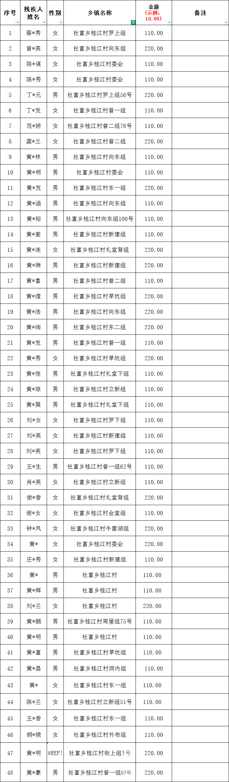 社富鄉桂江村2026年1月份殘疾人兩項補貼撥款名單