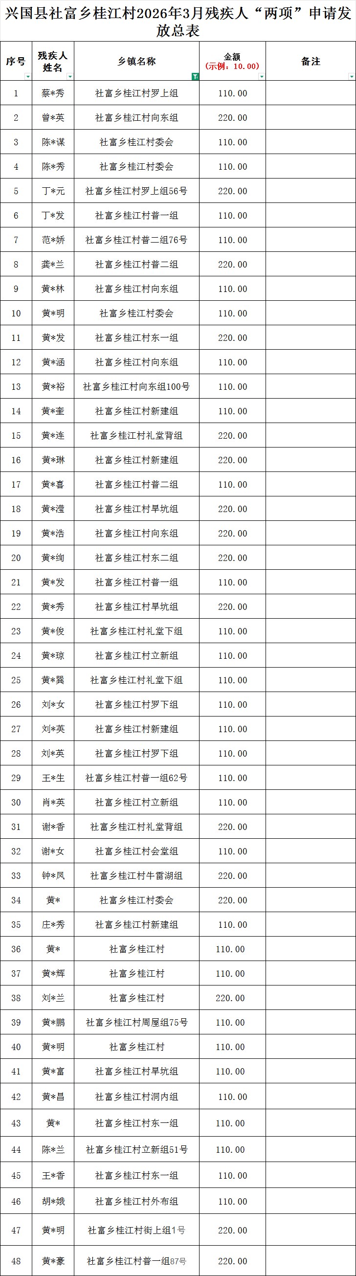 社富鄉桂江村2026年3月份殘疾人兩項補貼撥款名單