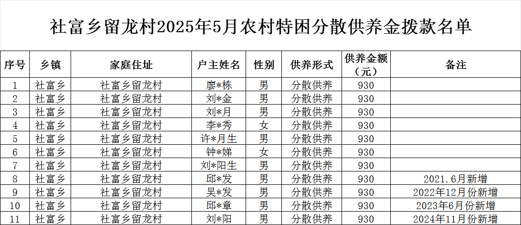 【社會救助】留龍村2025年5月特困確認樣表