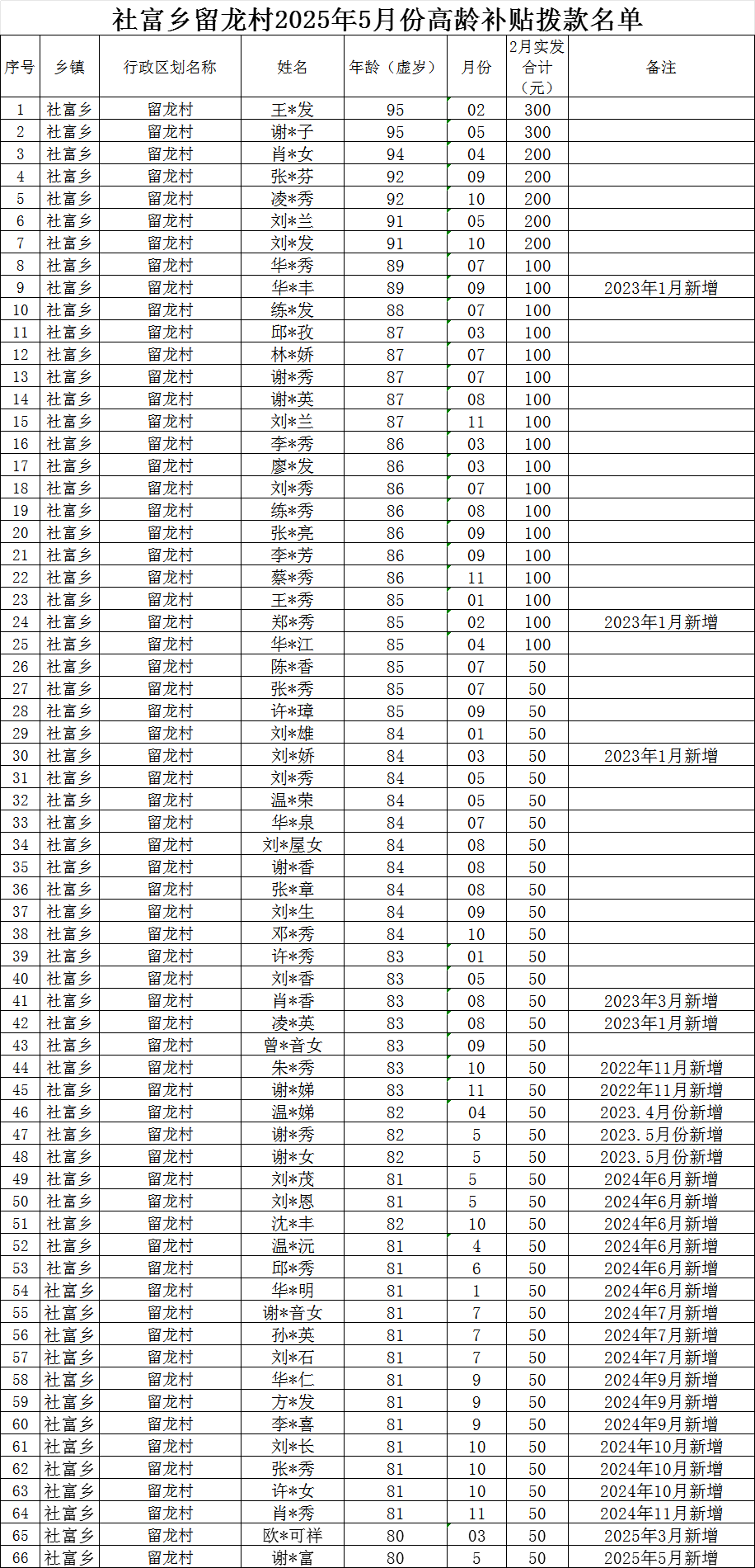 【養老服務】留龍村2025年5月高齡老人長壽名單