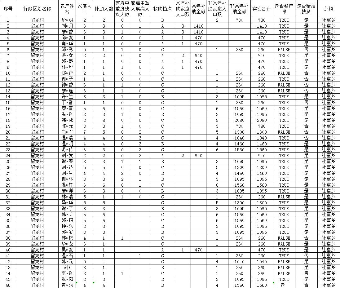 【社會救助】留龍村2025年6月份農村低保名單公示