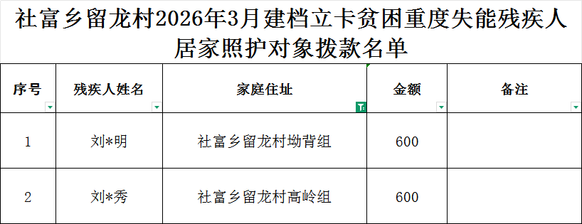社富鄉留龍村2026年3月建檔立卡貧困重度失能殘疾人居家照護對象撥款名單