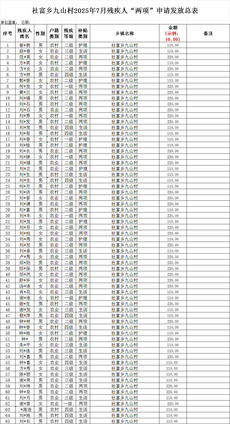 【社會救助】九山村2025年7月份殘疾人兩項補貼撥款名單公示