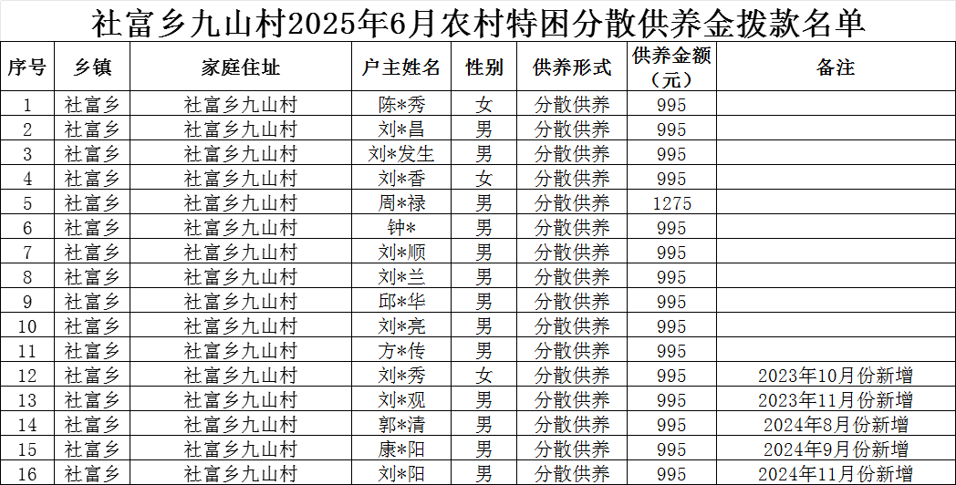 【社會救助】九山村2025年6月特困確認樣表