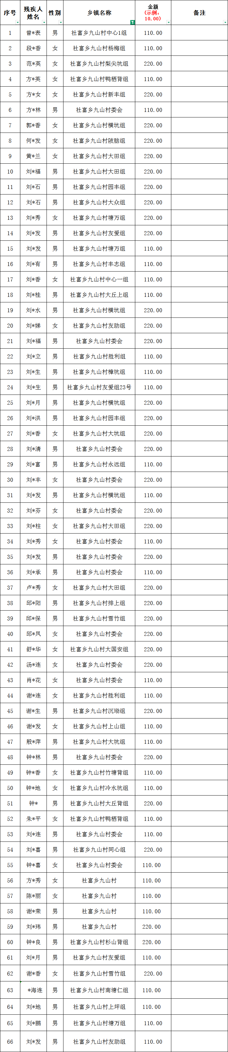社富鄉九山村2026年1月份殘疾人兩項補貼撥款名單