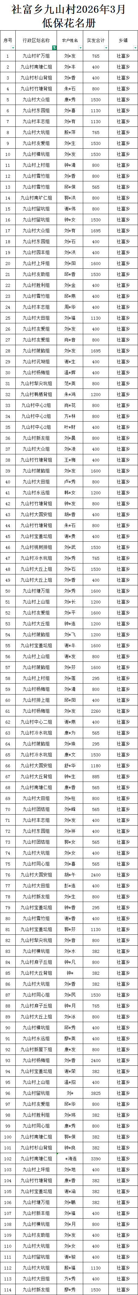 社富鄉九山村預報2026年3月份農村低保匯總名單