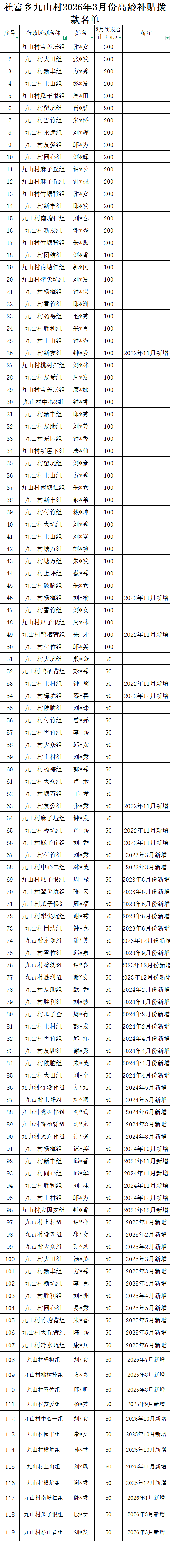 社富鄉九山村2026年3月高齡老人長壽名單
