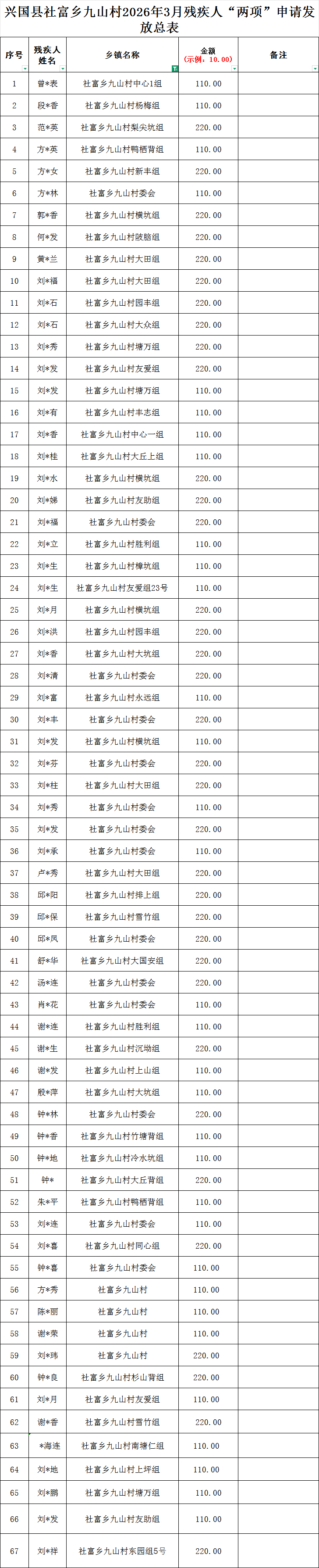 社富鄉(xiāng)九山村2026年3月份殘疾人兩項(xiàng)補(bǔ)貼撥款名單