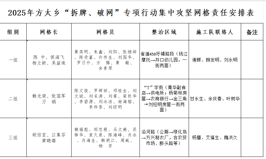 附件:2025年方太鄉(xiāng)“拆牌、破網(wǎng)”專項行動集中攻堅網(wǎng)格責任安排表