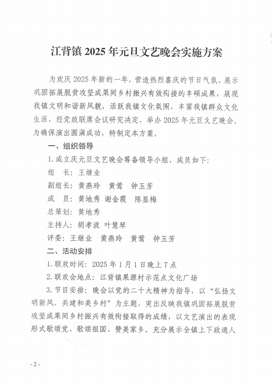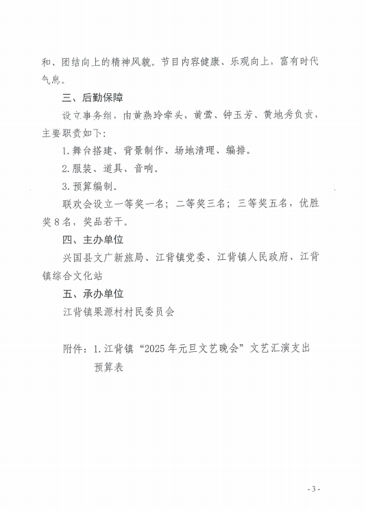 興國縣江背鎮人民政府關于印發《江背鎮2025年元旦晚會實施方案》的通知