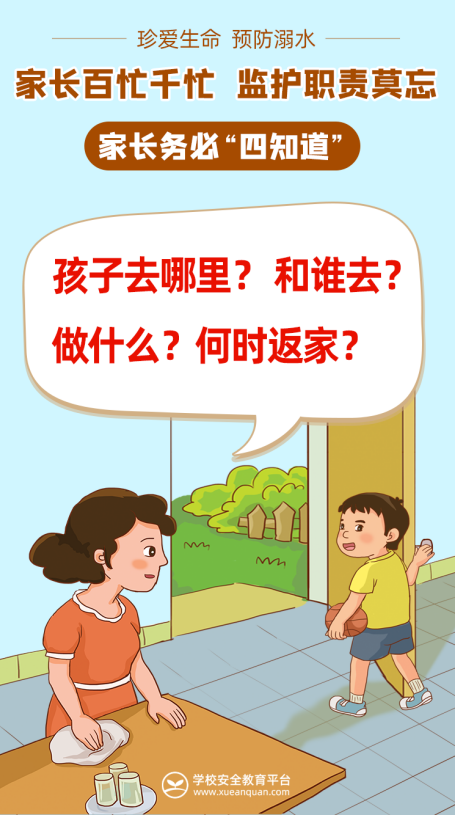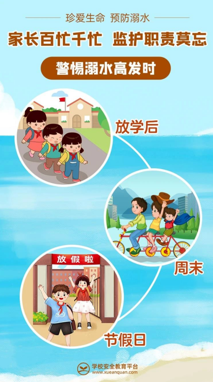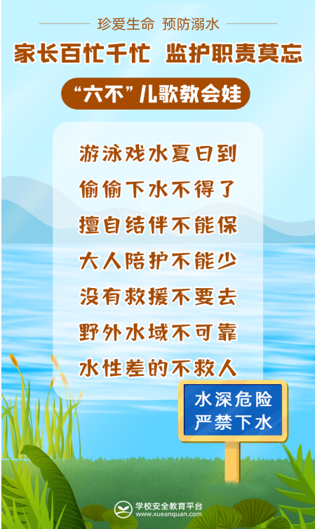 4.深入推進防溺水家校共育。不斷拓展家校聯系渠道,5月20日前要將《關于預防學生溺水致全國中小學生家長的信》(附件2)送到每一名學生家長的手中并統一收回回執,要求勾選好送達方式,嚴禁代簽現象發生。同時,一并要求學生與家長簽訂好《防溺水安全承諾書》(附件3),提升學生及家長的防溺水意識;要嚴格執行每周推送防溺水安全提醒信息不少于1次的工作制度,發動學校老師結合“萬師訪萬家”活動,上門宣傳防溺水安全知識,提升家庭安全防范意識,督促家長履行好未成年人安全監管職責,特別是在學生外出時做到“四知”(知去向、知活動內容、知伙伴、知歸時),開展留守孩關心關愛活動建立留守孩花名冊(附件4)督促監護人切實負擔起對少年兒童的監護責任,嚴防中小學生溺水事故的發生。
