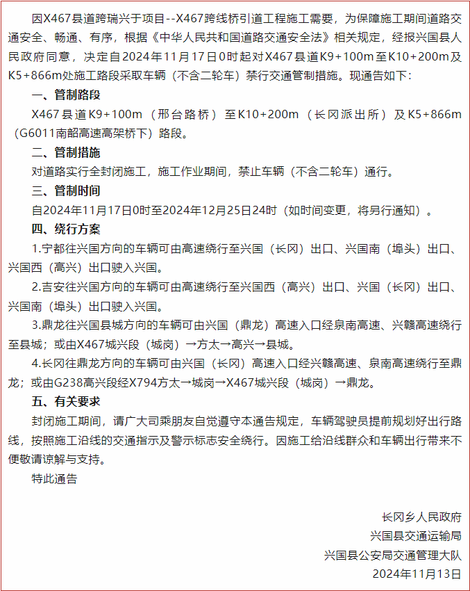 關于X467縣道K9+100m至K10+200m及K5+866m處(榔木-杞下)施工路段實施交通管制的通告