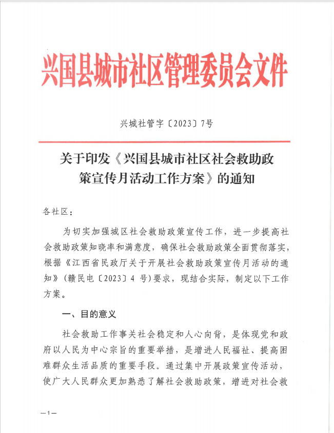 7關于印發《興國縣城市社區社會救助政策宣傳月活動工作方案》的通知
