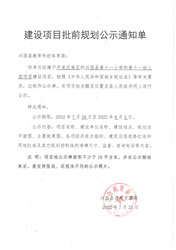 開(kāi)區(qū)區(qū)南區(qū)的興國(guó)縣第十一小學(xué)和第十一幼兒園項(xiàng)目建設(shè)項(xiàng)目批前規(guī)劃公示