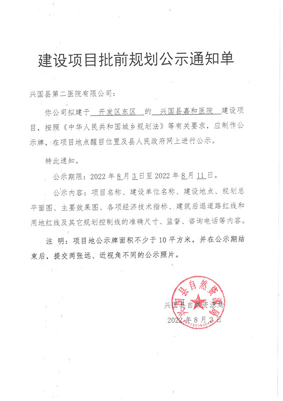 開發區東區的興國縣嘉和醫院建設項目批前規劃公示
