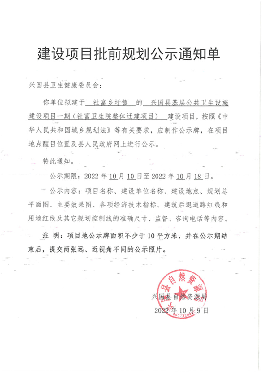 社富鄉圩鎮的興國縣基層公共衛生設施建設項目一期(社富衛生院整體遷建項目)建設項目批前規劃公示