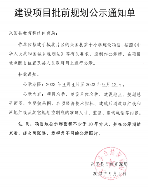 “興國縣第十小學”建設項目規劃批前公示