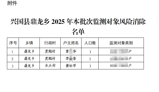 興國縣鼎龍鄉2025年本批次監測對象風險消除名單