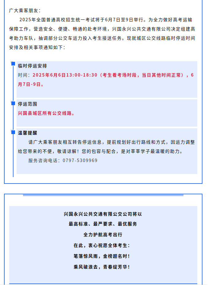 關于2025年興國縣高考期間城區公交車運行安排通告