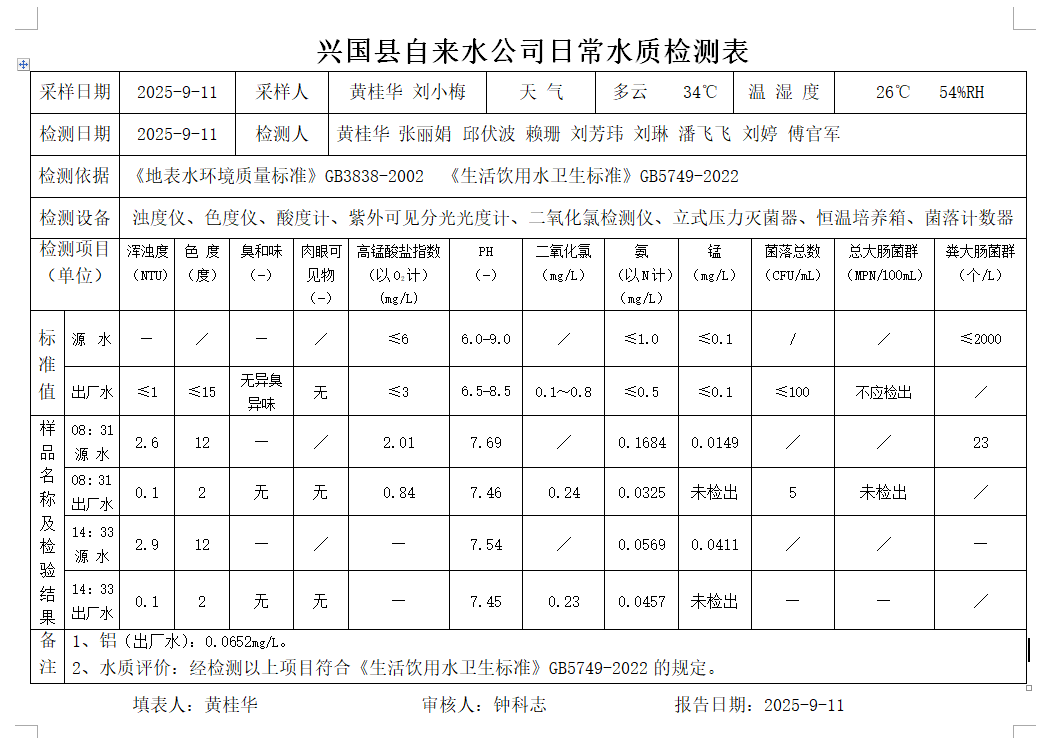 水質常規(guī)檢測臺賬(2025年9月11日)