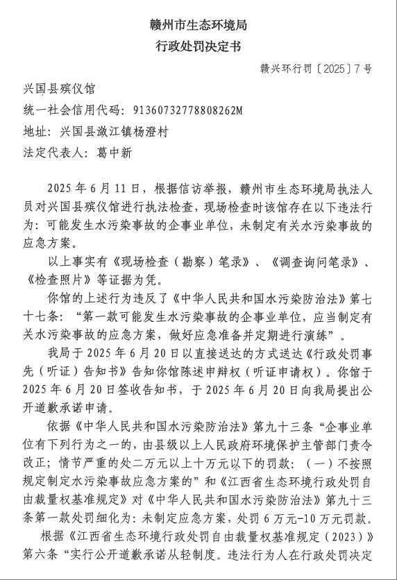 興國縣殯儀館行政處罰決定書公示(贛興環行罰〔2025〕7號)
