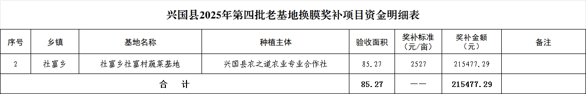 2025年第四批蔬菜基地?fù)Q膜項目已完成鄉(xiāng)村聯(lián)合初驗和縣級復(fù)核。經(jīng)驗收,現(xiàn)有1個蔬菜基地,1個申報主體符合獎補條件,核定總面積85.27畝,擬兌付獎補資金總額215477.29元。